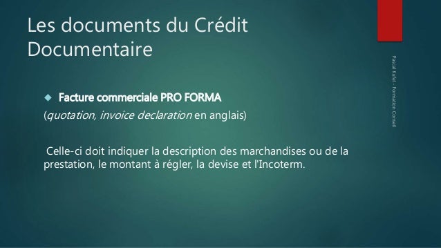 Crédit Montage TPL Par Ton Petit Look 11 mars 19 • 15 Cette semaine, mon enfant est à Québec avec sa mamie et j’ai eu le luxe d’écouter trois documentaires vraiment intéressants Et quand même fâchants. Un crédit documentaire irrévocable confirmé, par exemple, donne au vendeur la certitude qu’il sera rapidement payé contre présentation des documents conformes En revanche, il apporte des avantages moins évidents à l’acheteur, et même quelques inconvénients En principe, l’acheteur assume les frais du crédit documentaire. Formation crédit documentaire Maîtriser le CREDOC Le crédit documentaire (CREDOC), ou lettre de crédit, correspond à une opération financière se déroulant dans un cadre international Son application nécessite la présence de plusieurs acteurs le cliant acheteur, la banque du client importateur, un bénéficiaire et la banque du vendeur.