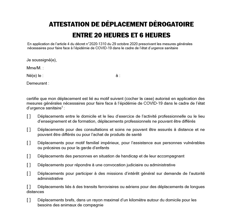 Couvre Feu Une Attestation De Deplacement Derogatoire A Telecharger