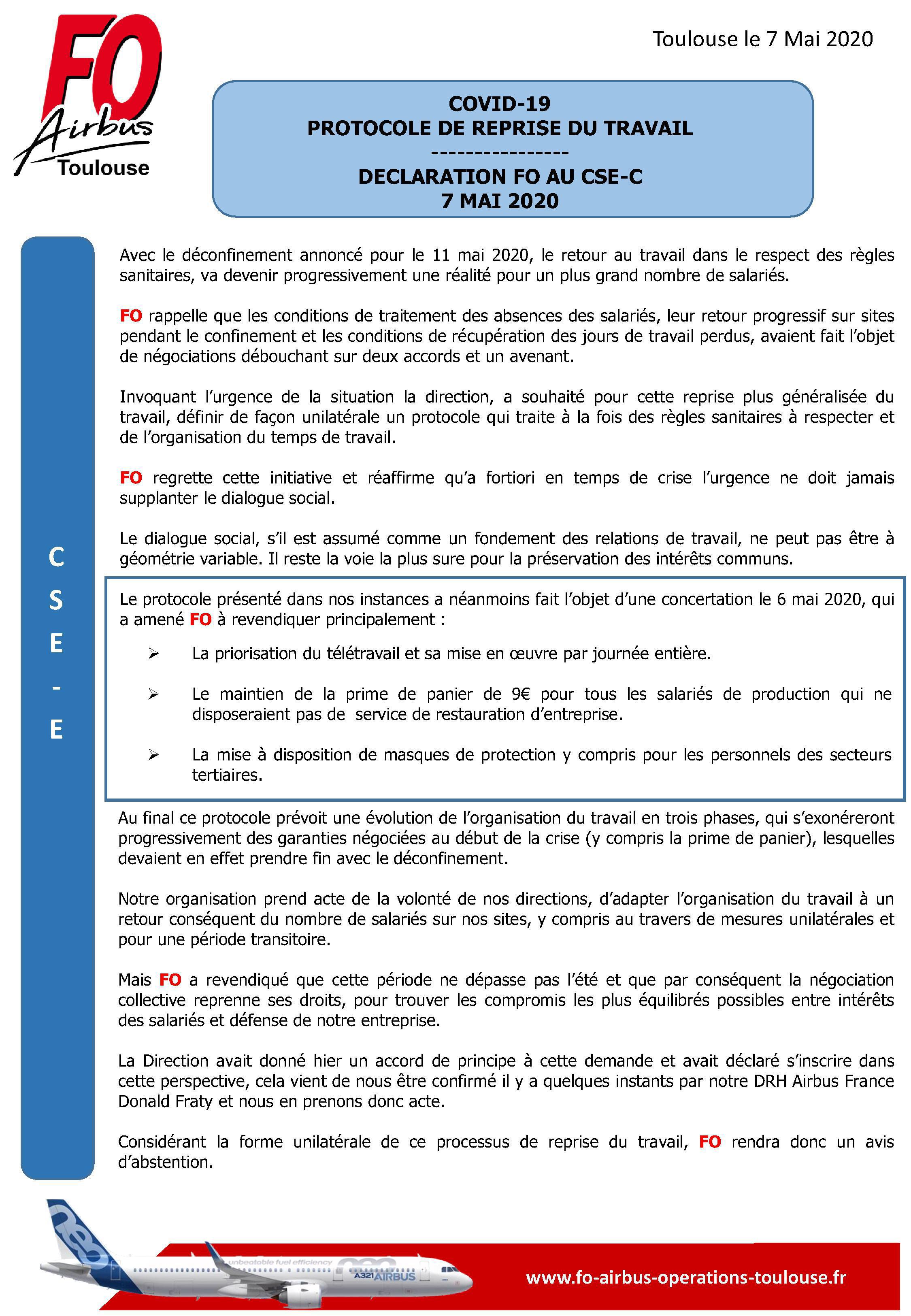 Protocole De Reprise Du Travail Declaration Au Cse C Du 7 Mai